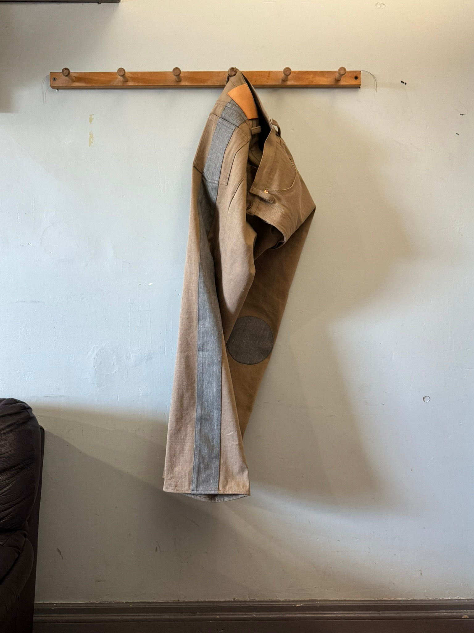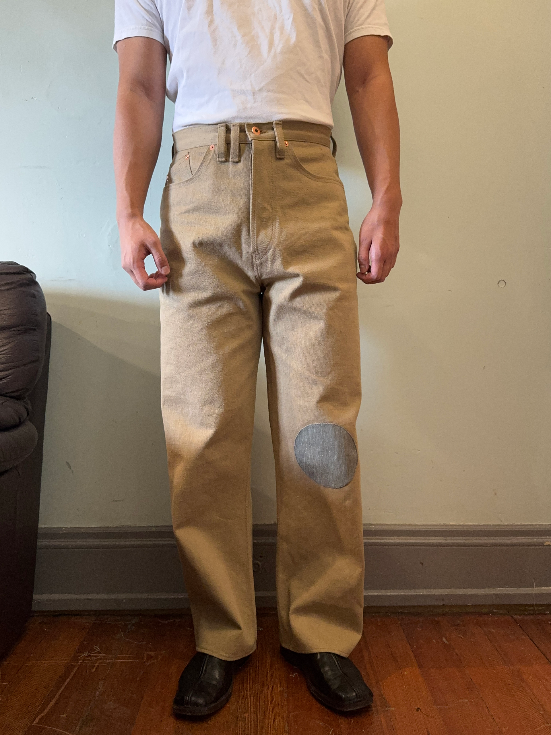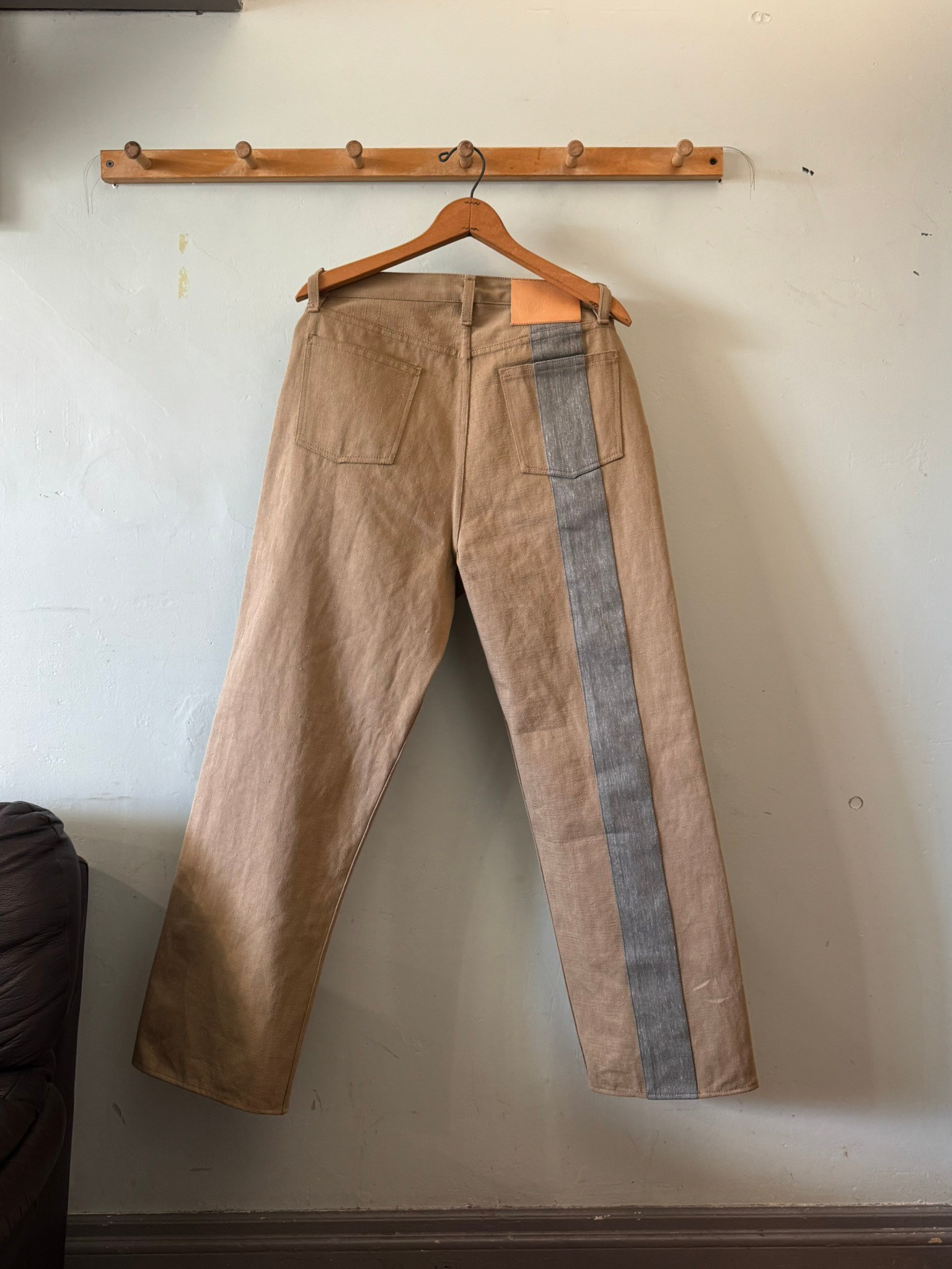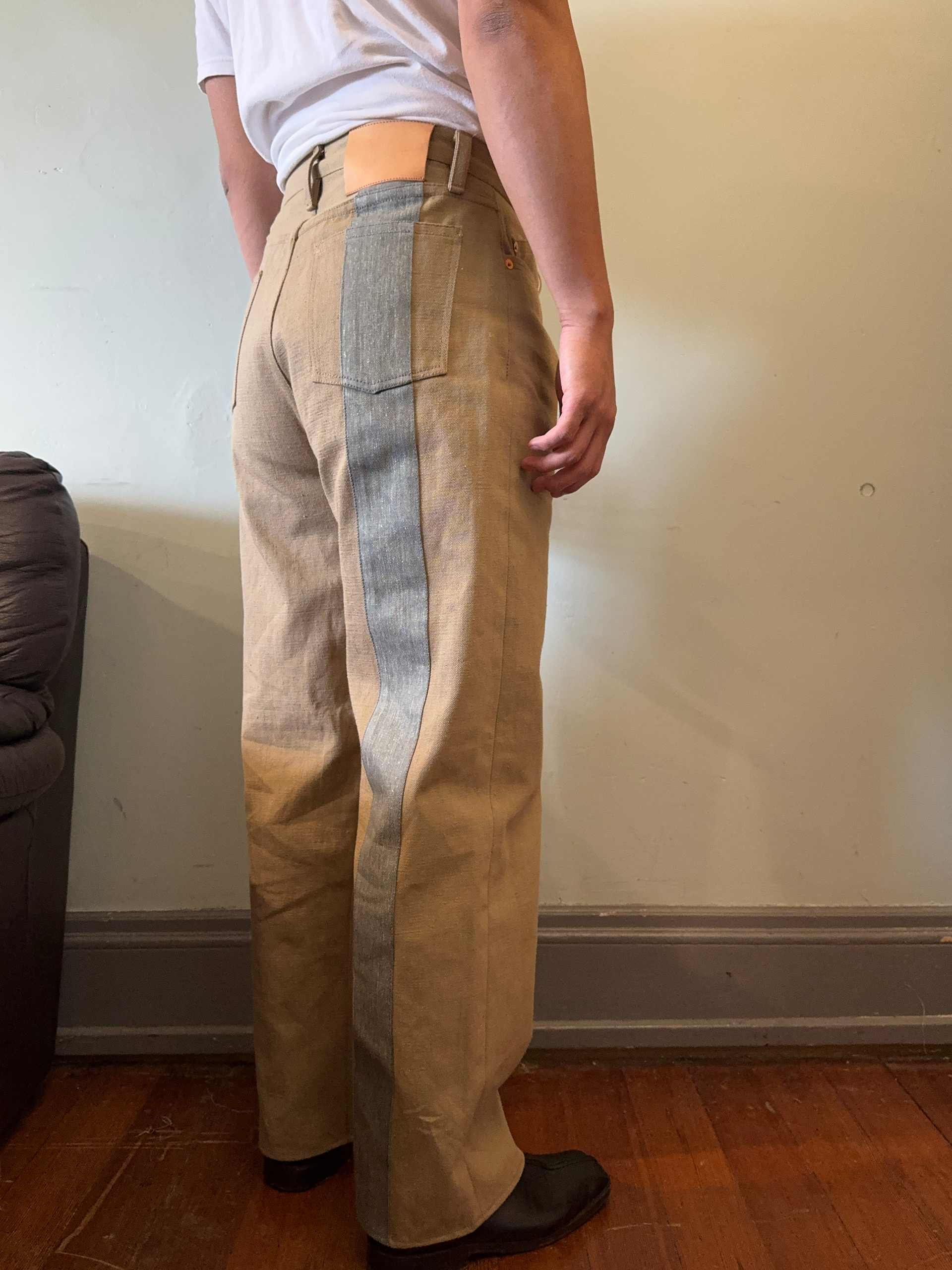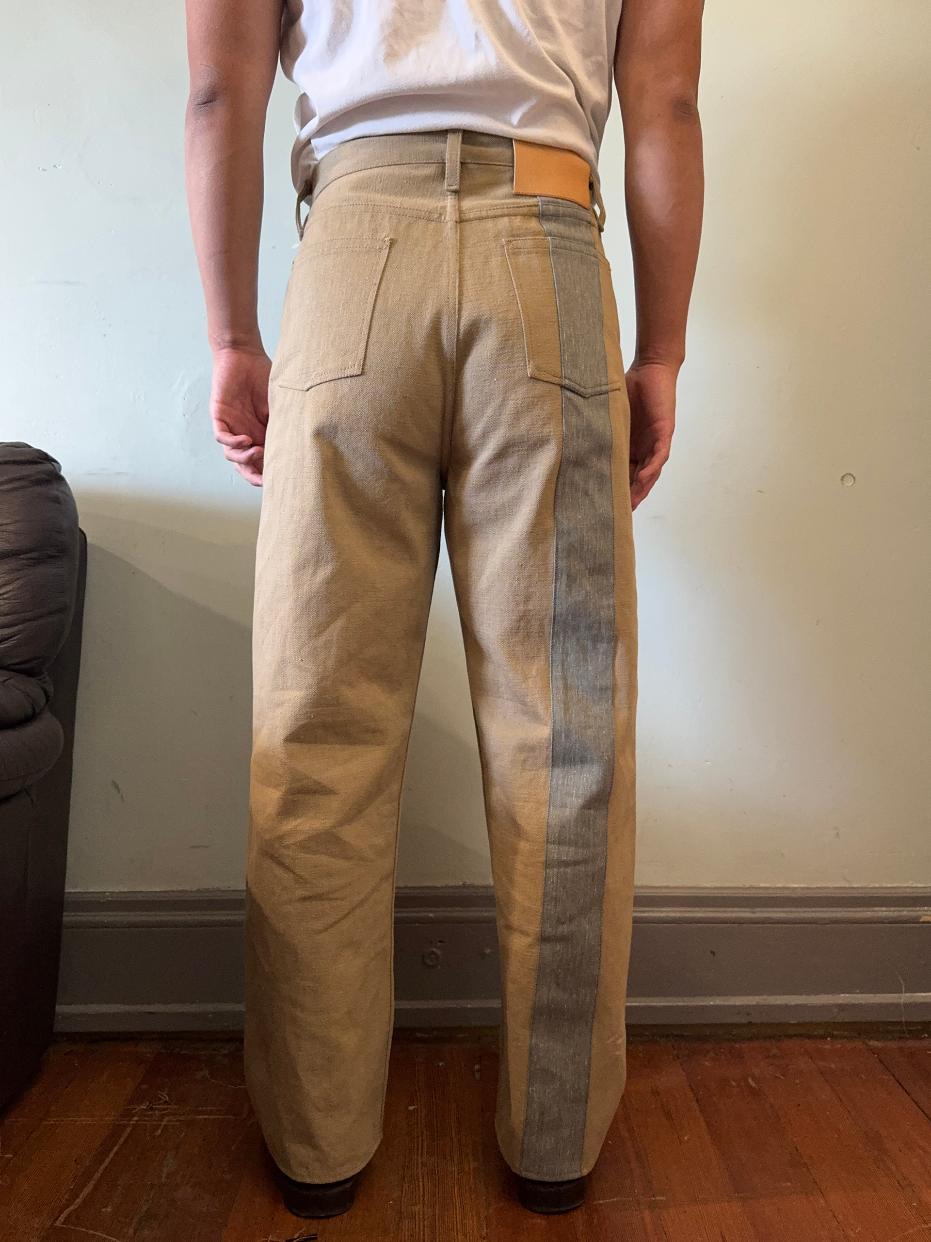 Fabric: 11.5 oz khaki cotton selvedge denim, 11 oz grey cotton selvedge denim.