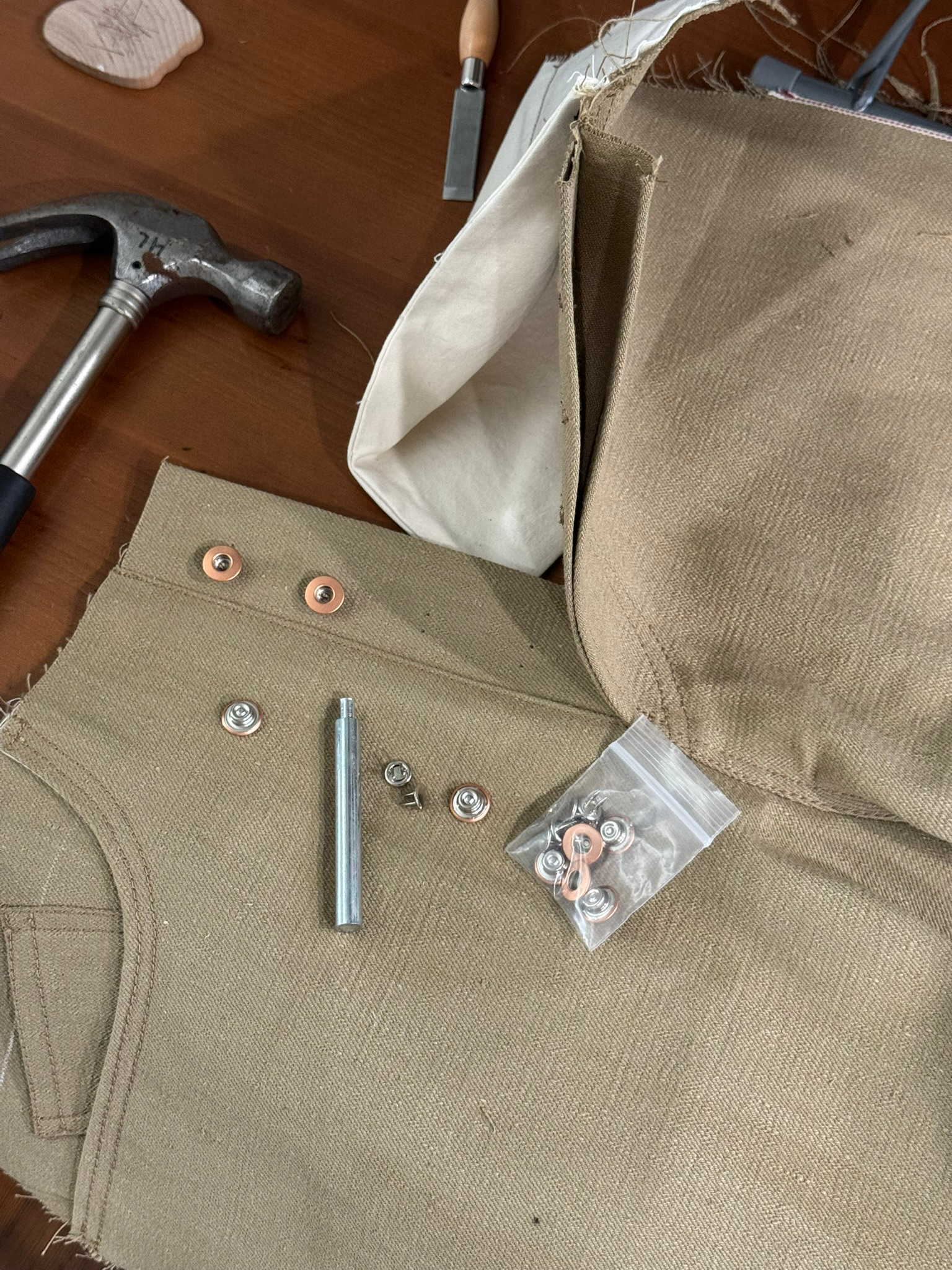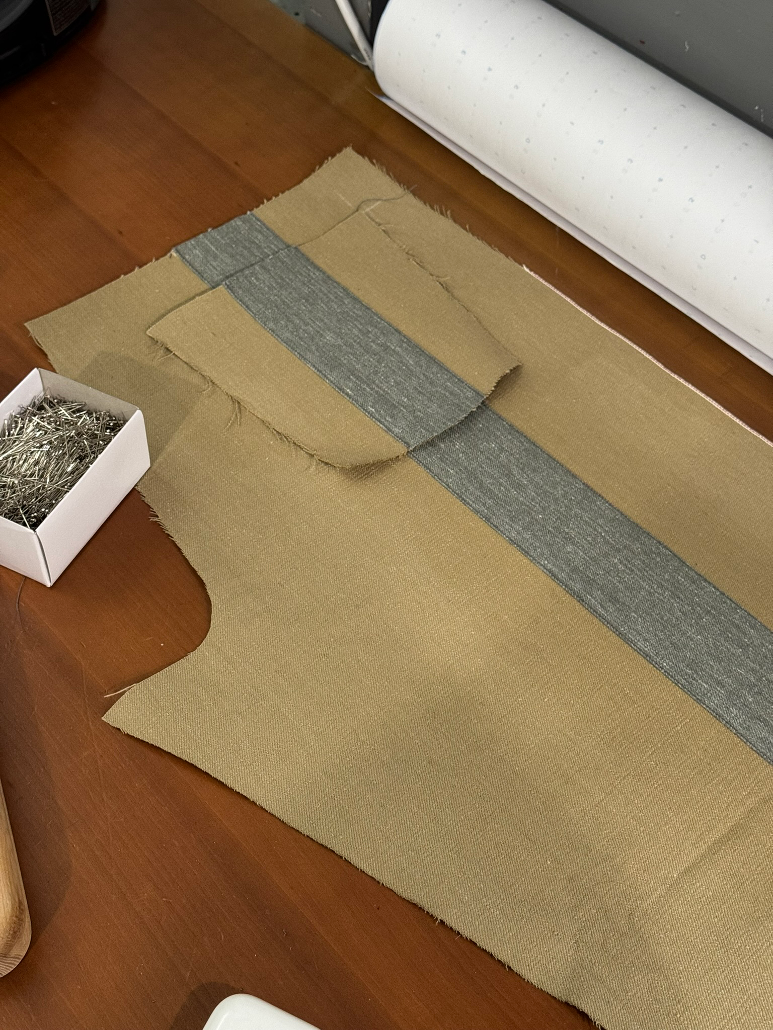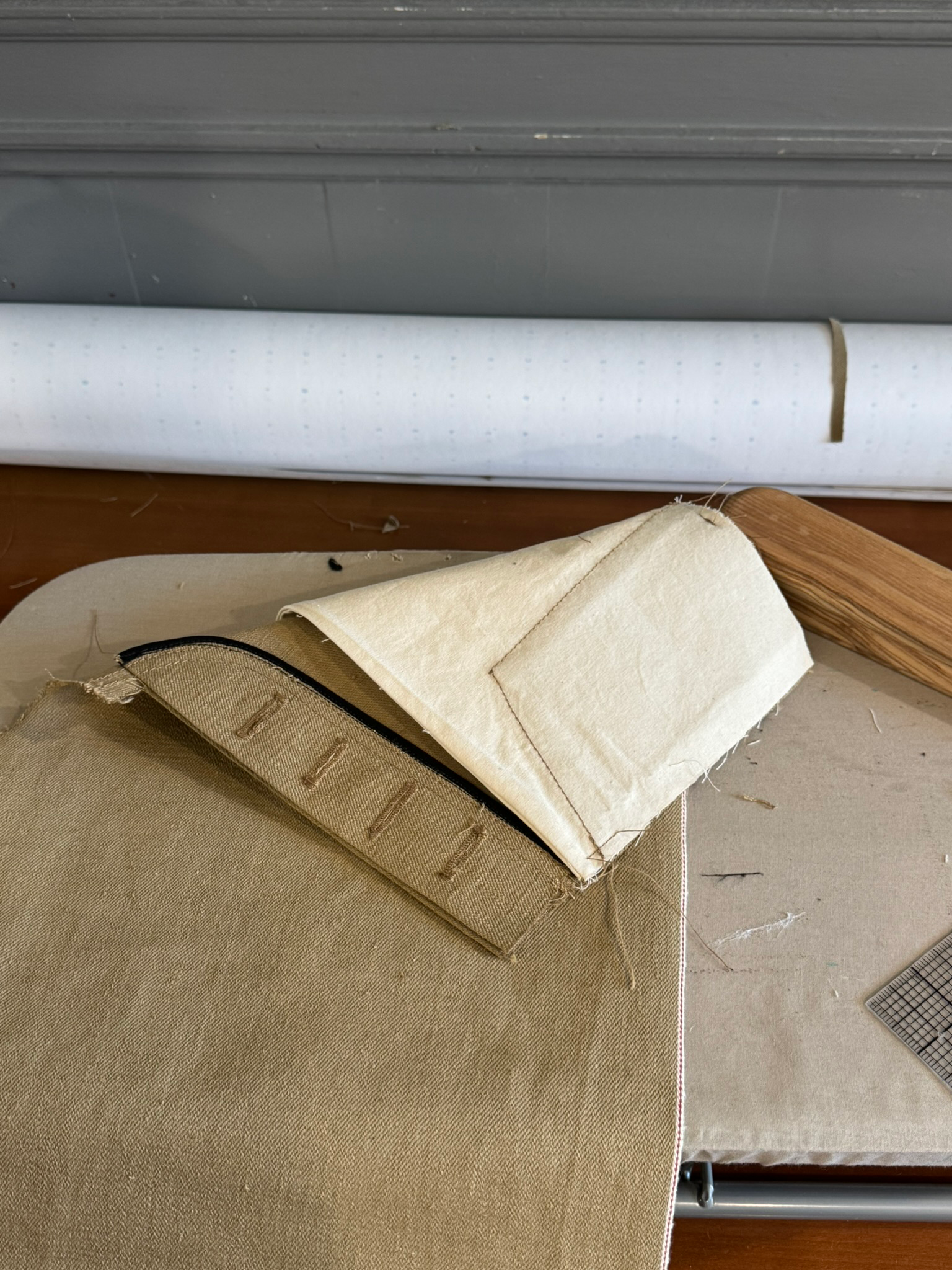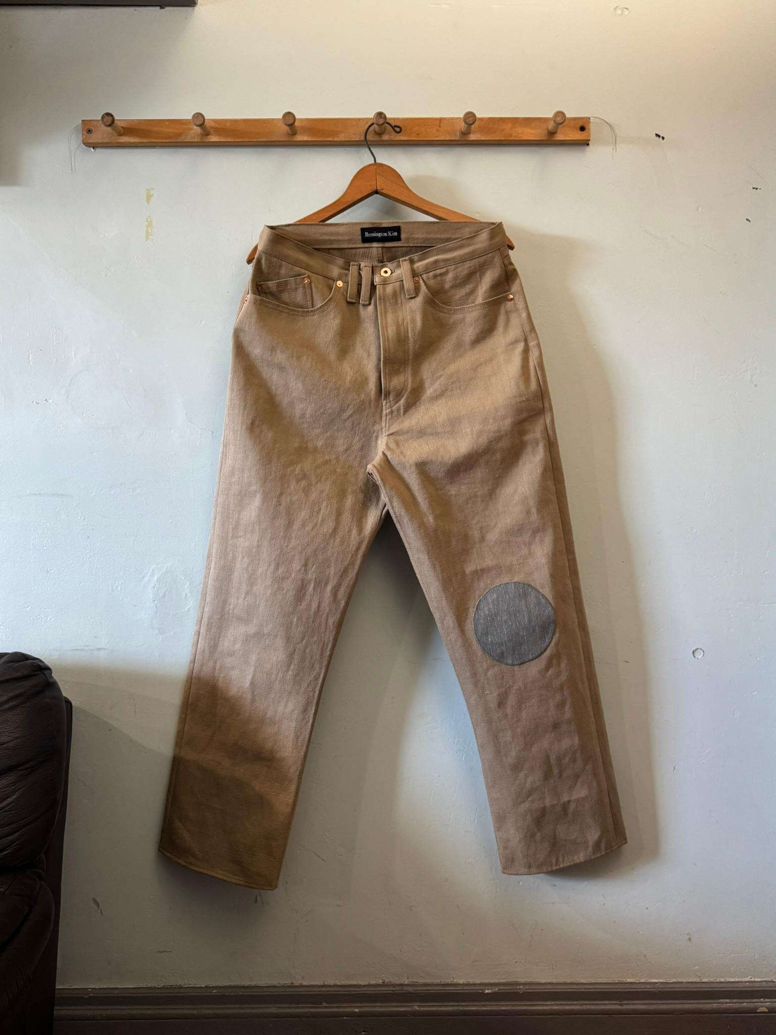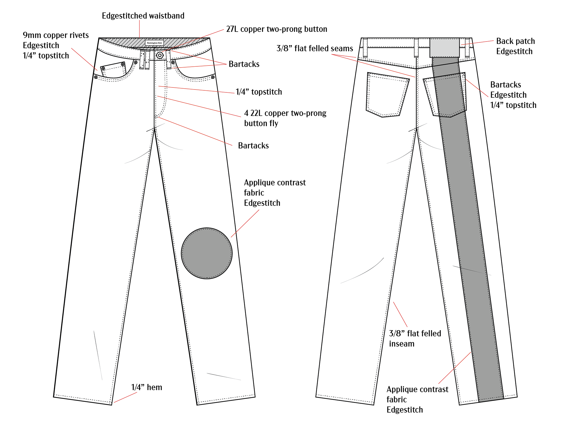 Fabric: 11.5 oz khaki cotton selvedge denim, 11 oz grey cotton selvedge denim.