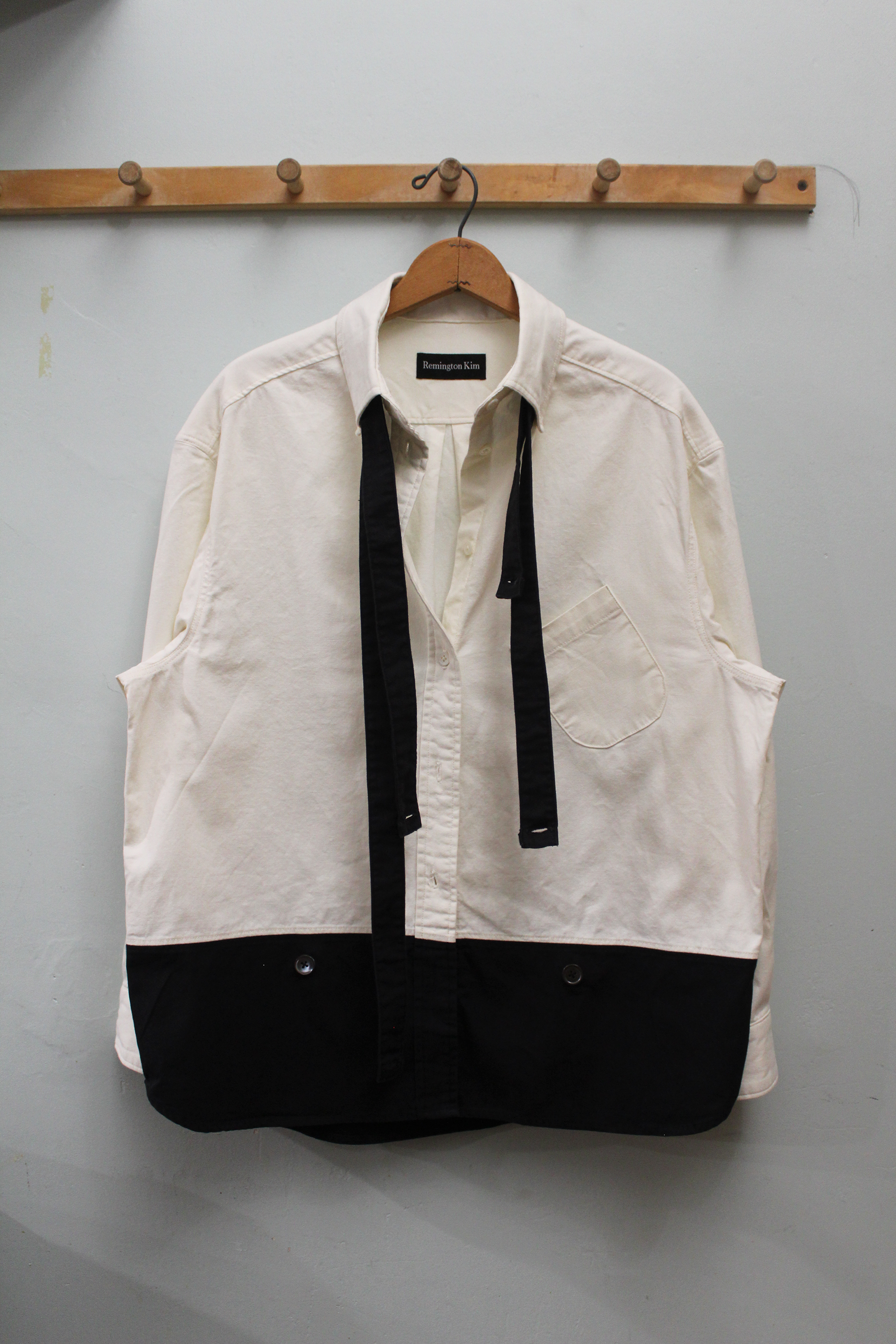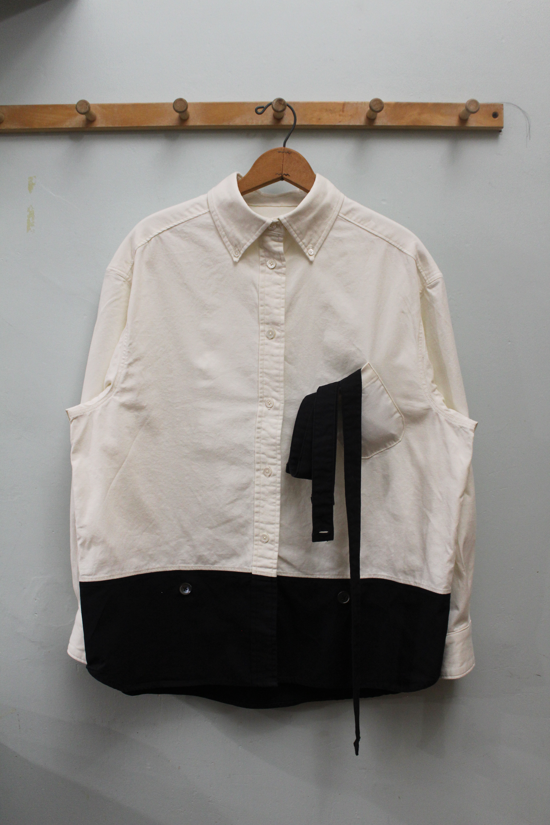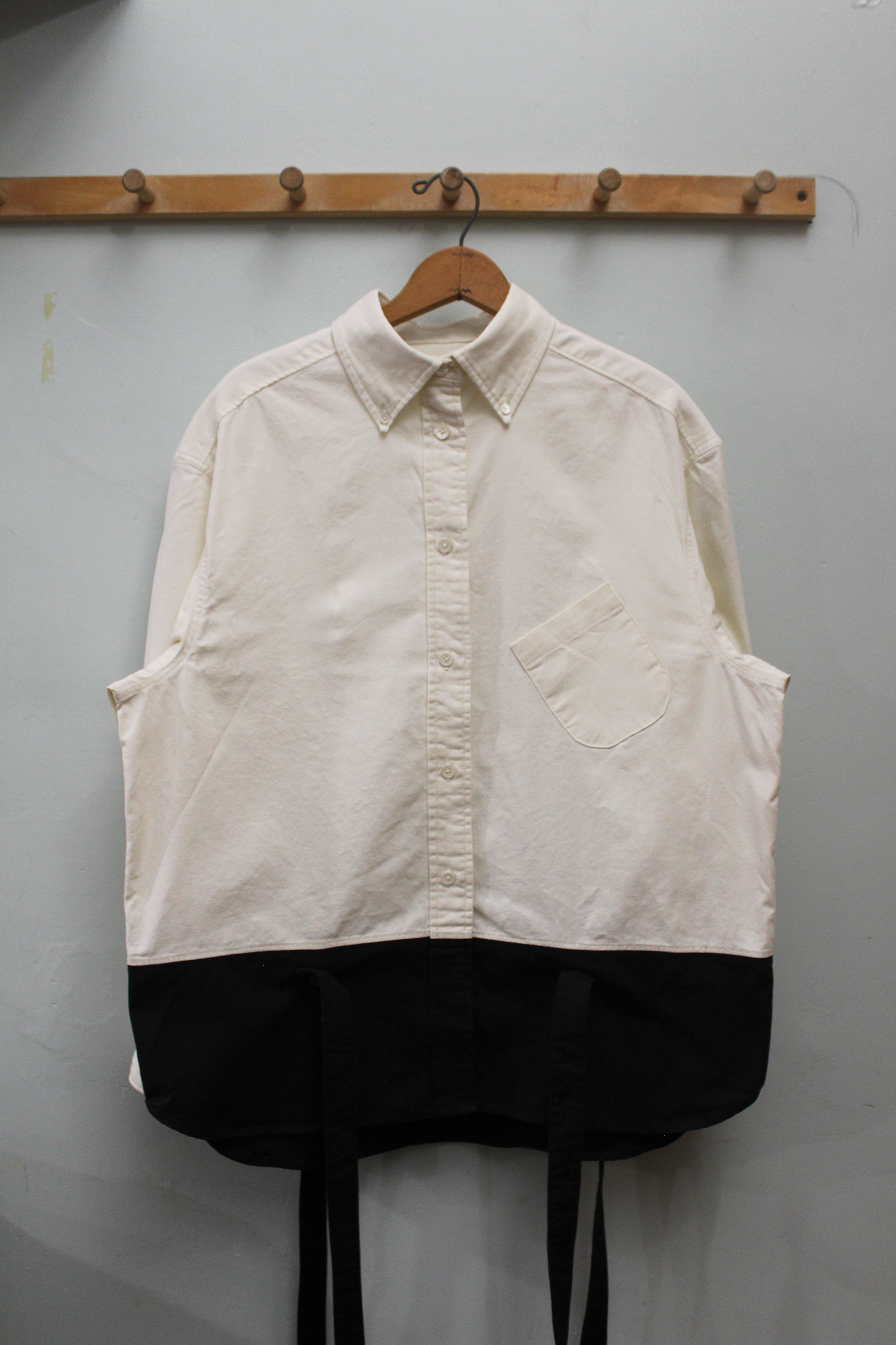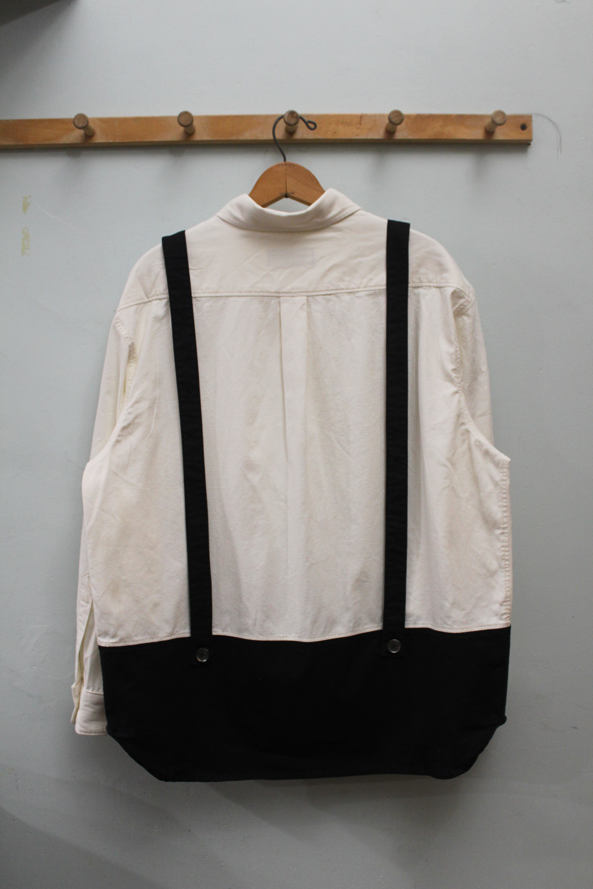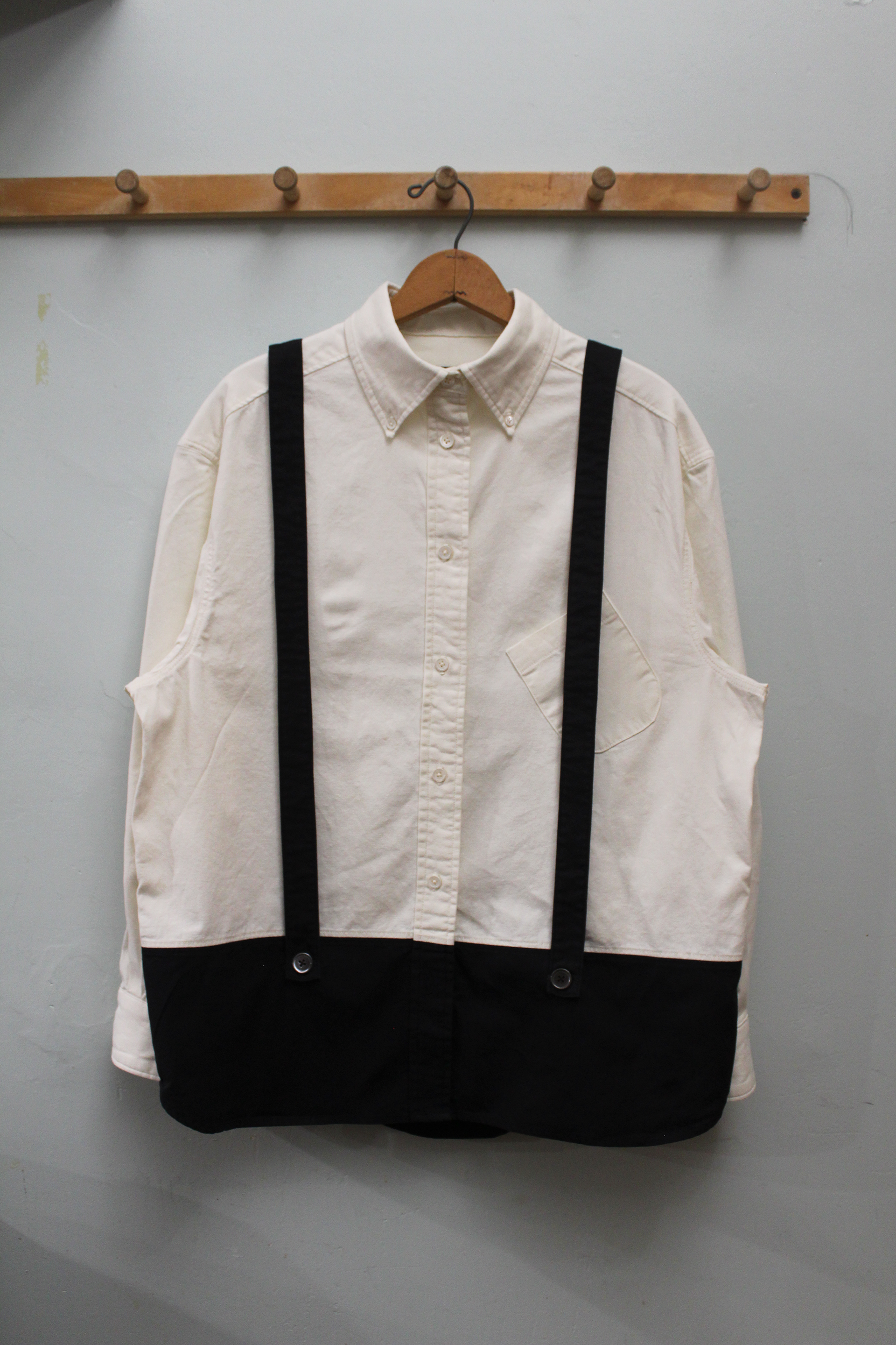 A button down shirt with faux suspenders and a black lower third for pairing with black bottoms.